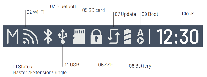 - Wi-Fi/Client mode: activated / deactivated / connection error / Access Point mode / connected to the internet