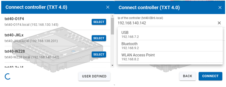 - All visible devices will be displayed, including the ROBOTICS TXT 4.0 Controller. Double click the TXT 4.0 Controller to select it.