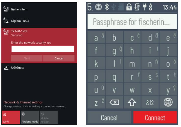 - Then, the network security key must be entered. This can be read off from the Controller display under Settings – Network / Access Point / Passphrase.