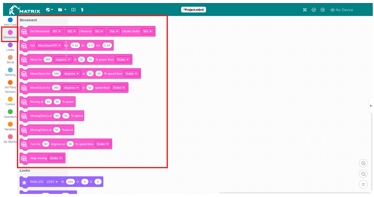 Note: The movement blocks are optimized for two-wheeled robots and work best with motors equipped with encoders, ensuring accurate and reliable motion control. However, if precise rotation in degrees is not required, you can also synchronize movement using a gyro sensor with non-encoder motors.